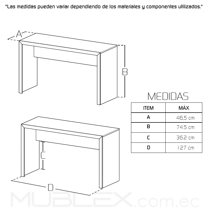 | Dimensiones | Largo: 127 cm Ancho: 46.5 cm Alto: 74.5 cm |