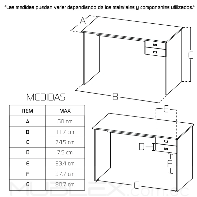 | Dimensiones | Largo: 117 cm Ancho: 60 cm Alto: 74.5 cm |