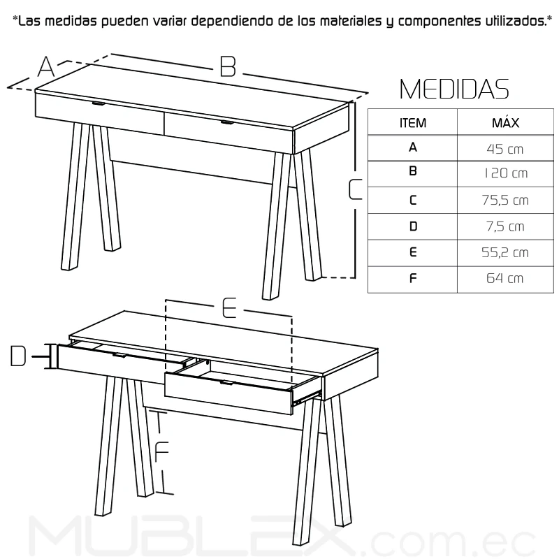 | Dimensiones | Largo: 120 cm Ancho: 45 cm Alto: 75.5 cm |