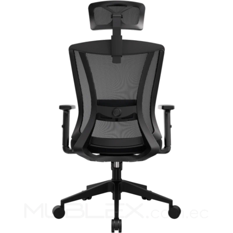 Silla ergonómica con cabecero regulable en ángulo y altura y apoyo lumbar regulable en altura y profundidad.